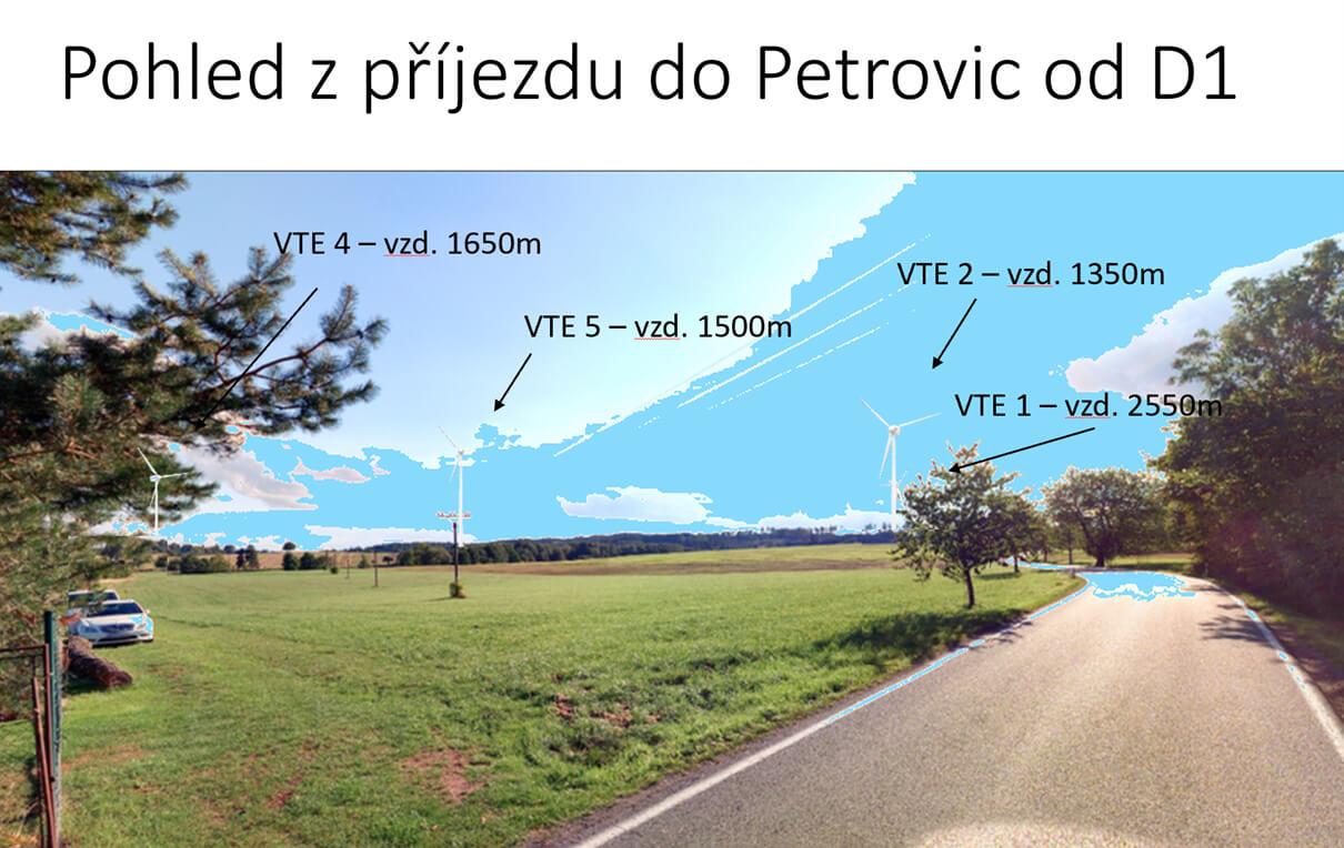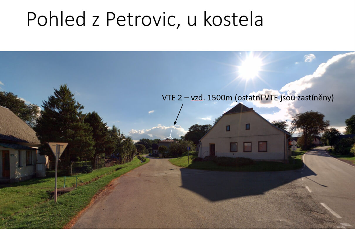 Ze samotné obce Petrovice díky svažitému terénu a zastínění domy a vegetací již bude viditelnost VTE velmi omezená.
