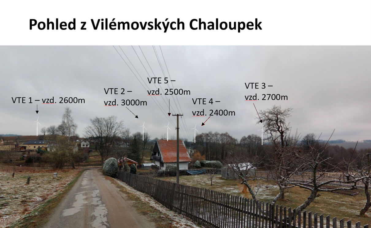 Ze strany Smrčné budou VTE nejvíce na obzoru z vyvýšených partií na Vilémovských Chaloupkách.